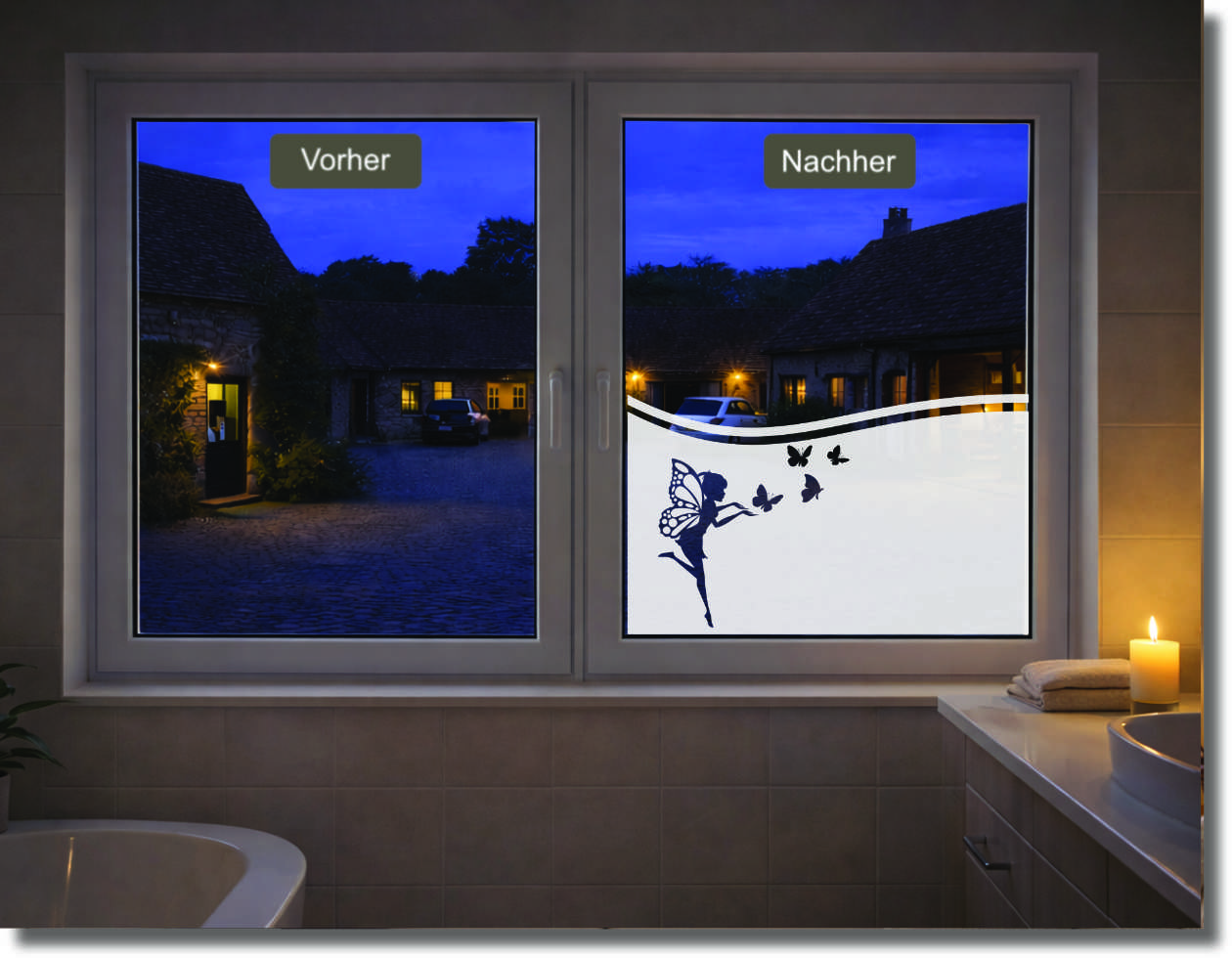 Die Fensterfolie „Elfe mit Schmetterlingen“ schafft mit ihrem dezenten, harmonischen Design eine angenehme Atmosphäre im Bad, Spa- oder Ruhebereich. Sie schützt zuverlässig vor Blicken, lässt aber ausreichend Licht hindurch – perfekt für entspannte Momente. Die hochwertige, selbstklebende Folie ist leicht anzubringen, pflegeleicht und rückstandslos entfernbar. Ideal für alle, die Wellness und Stil verbinden möchten.