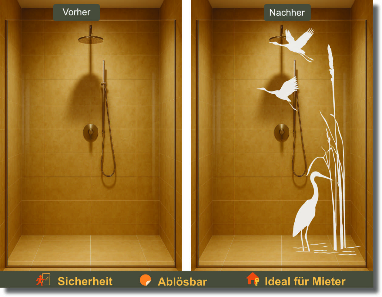 Unsere hochwertige Duschdekorfolie Fischreiher im Flug ist die perfekte Lösung für alle, die ihre Glastüren stilvoll gestalten und gleichzeitig praktische Vorteile nutzen möchten. Ideal für Mietwohnungen, denn die selbstklebende Folie lässt sich bei Bedarf rückstandsfrei entfernen. Durch die Dekorfolie bleibt die Glasfläche sichtbar, wirkt jedoch dezent und stilvoll.